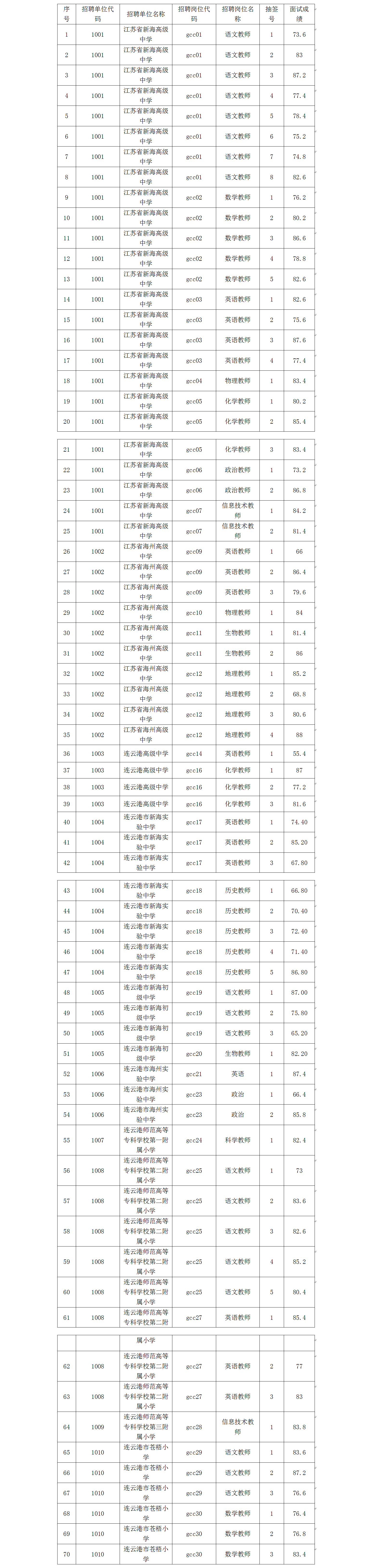 连云港市教育局直属学校2018年赴高校公开招聘编制内新教师面试工作已经结束。现将成绩公布如下: